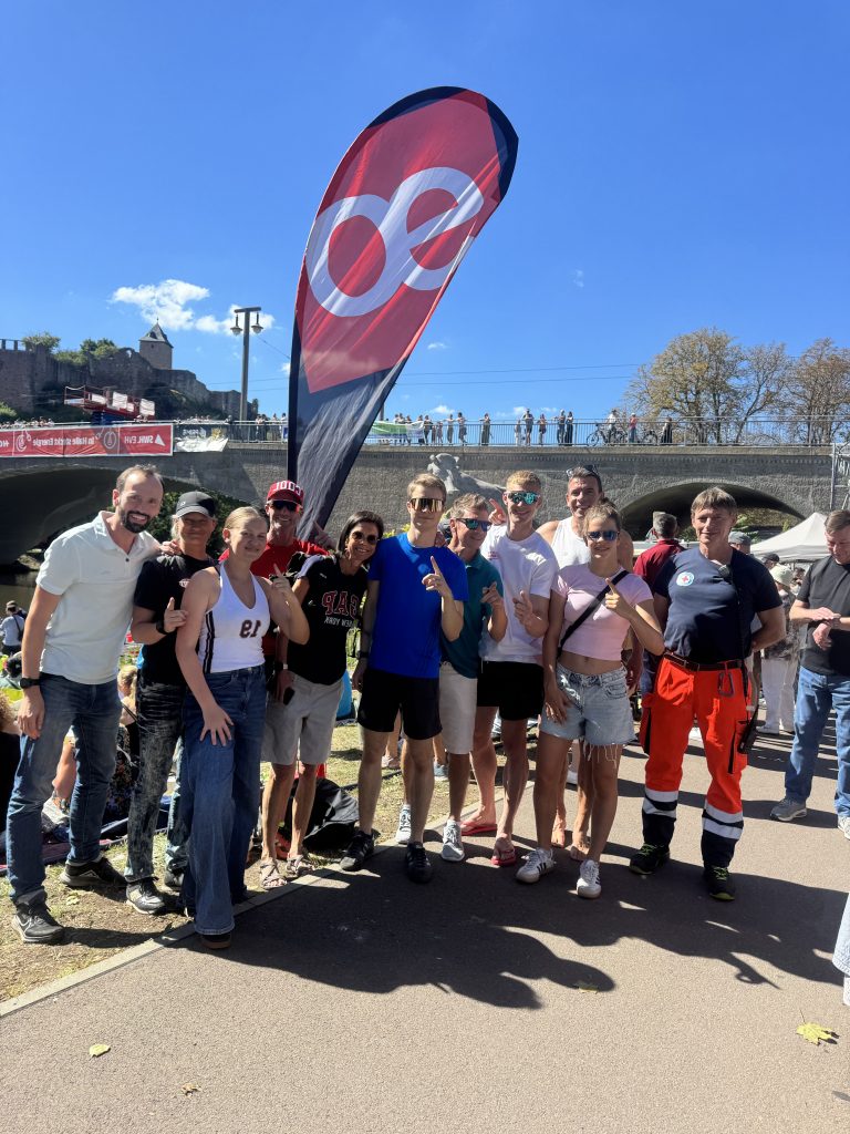 Vor ca 6500 Zuschauern sprang unser Nils zweimal in die 22C kalte und ca 4,70m Tiefe Saale. Aus 15m Höhe zeigte Nils als 1. eineinhalb Salto rückwärts mit eineinhalb Schrauben und dann noch einen Barani (Salto vorwärts mit halber Schraube) aus 20m Höhe. Unser Team stand am Ufer und feuerte alle mutigen Springer tatkräftig an.